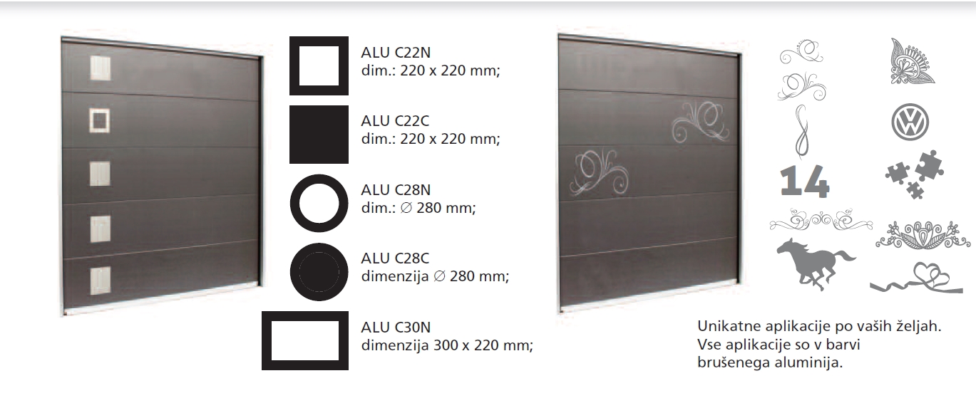 In Seitensektional-Garagentoren können Fenster integriert werden, die in verschiedenen Größen, Formen und Dekorationsmotiven erhältlich sind. Die Aluminiumfenster können in grauer Alu-Farbe oder in jeder gewünschten Farbe gemäß der RAL-Skala geliefert werden.
