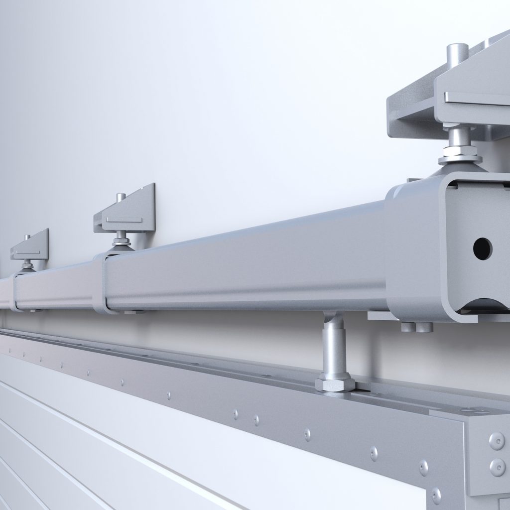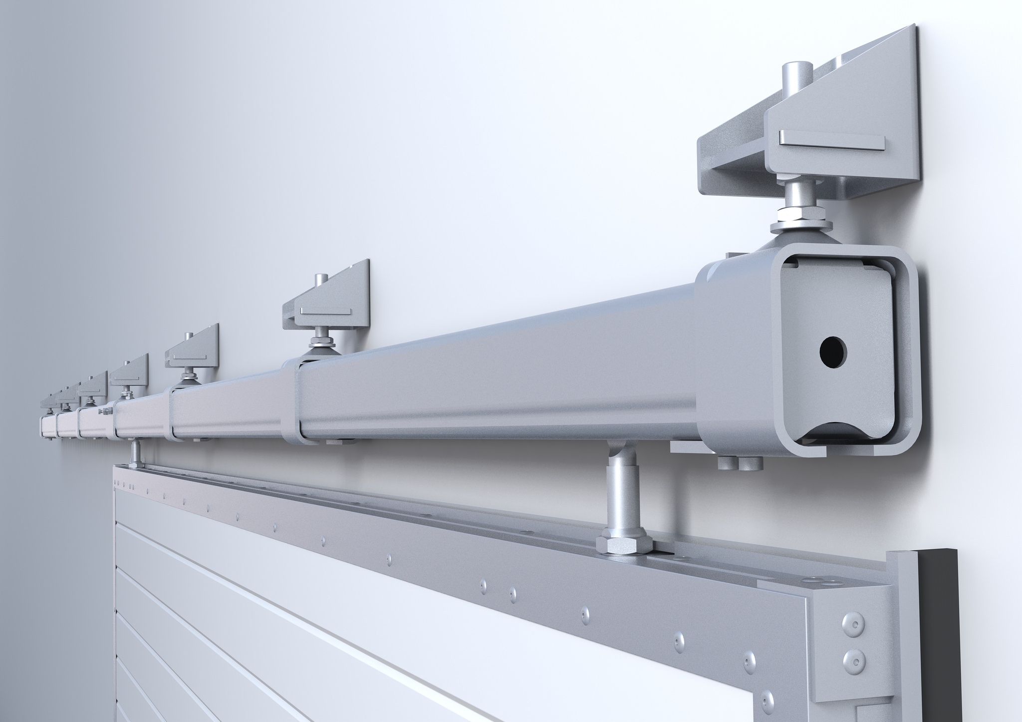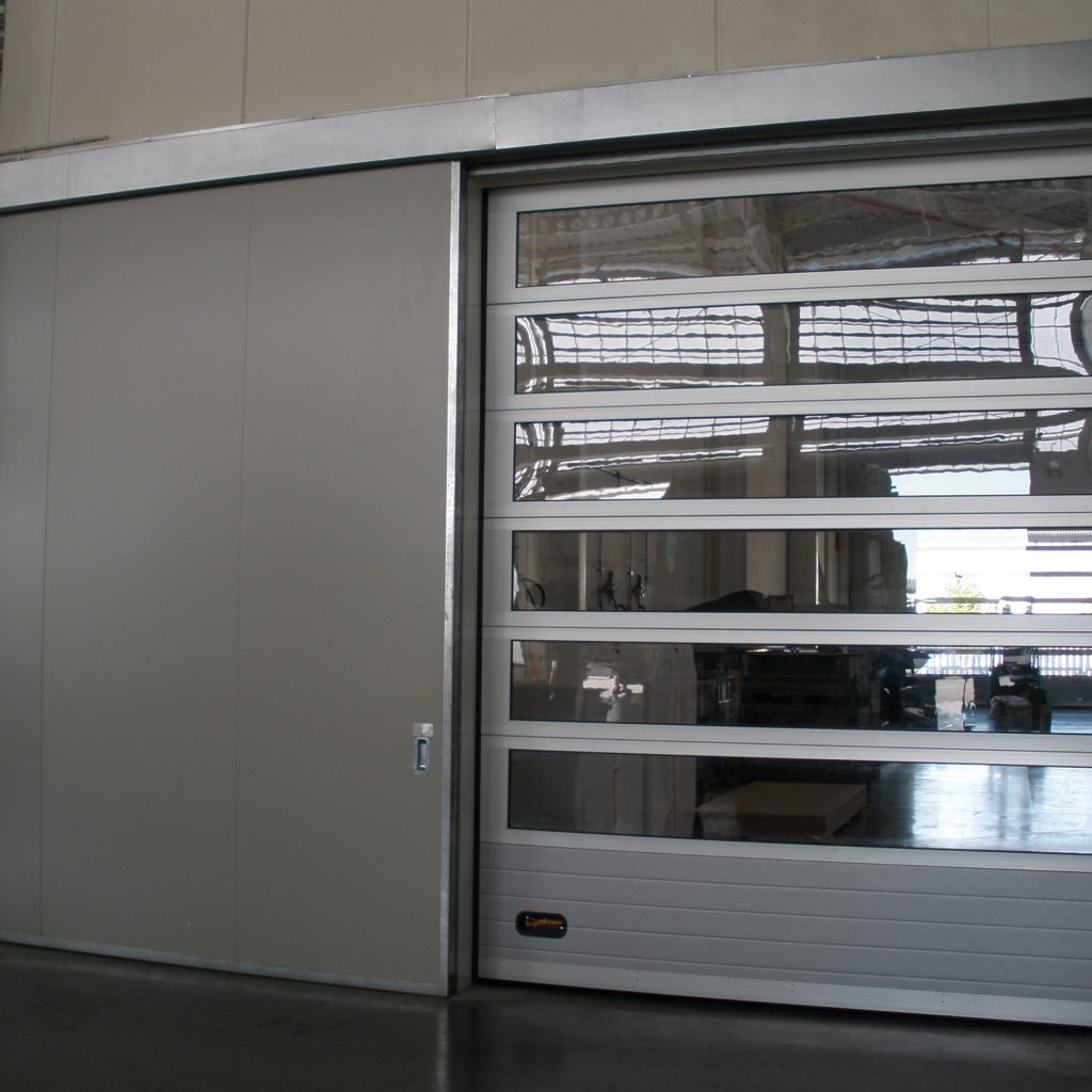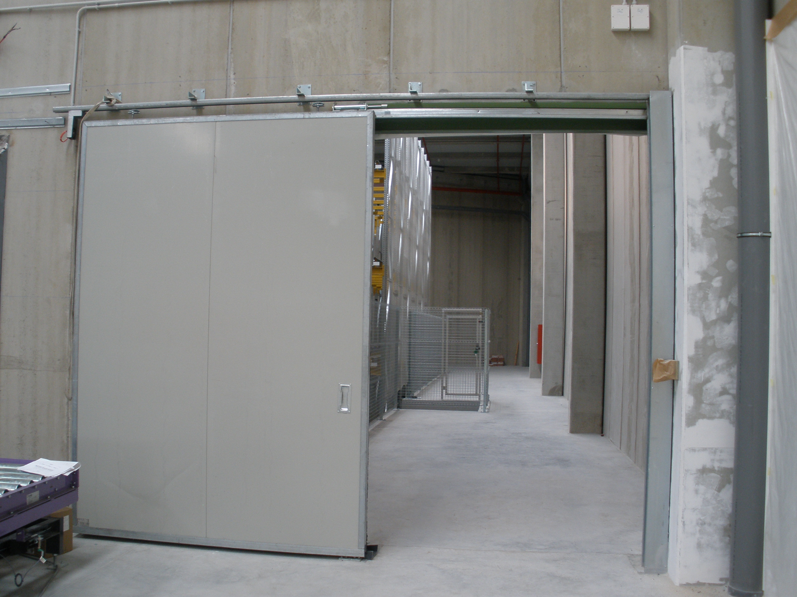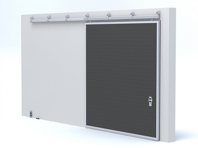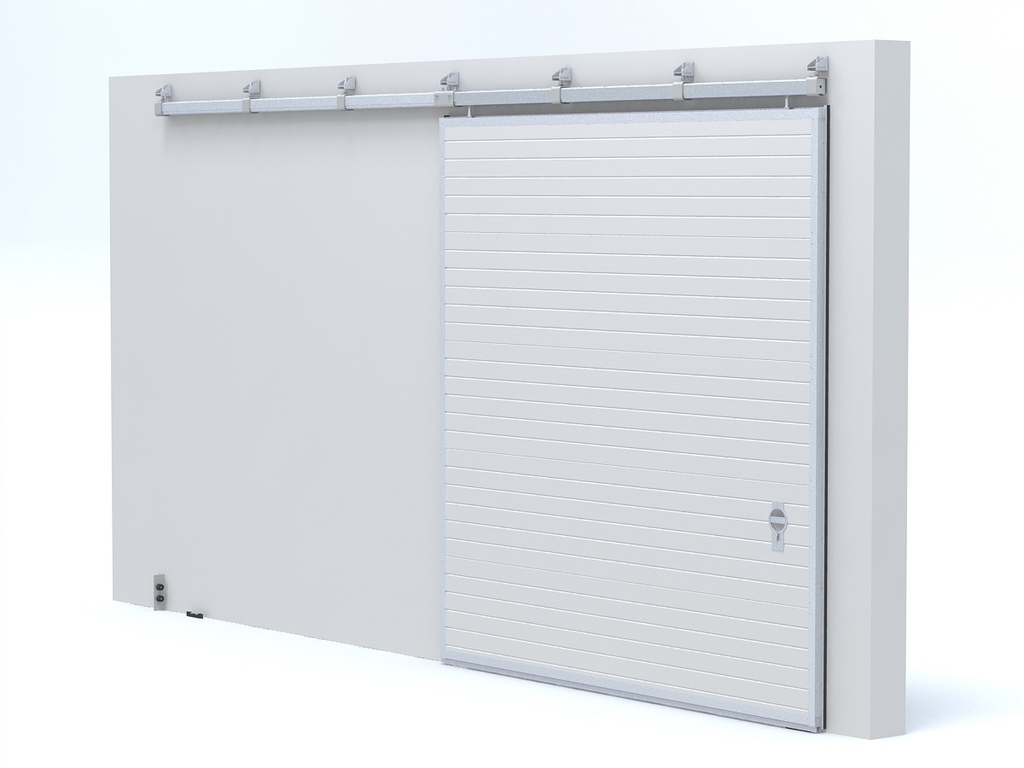 Industrie-Seitenschiebetore bestehen aus verzinkten Stahlpanels mit einer Dicke von 4 cm und einer Polyurethanfüllung, die als Isolierung dient. Das Tor ist als Einzelstück gefertigt und bewegt sich entlang der Wand, sowohl auf der Innen- als auch auf der Außenseite des Gebäudes.