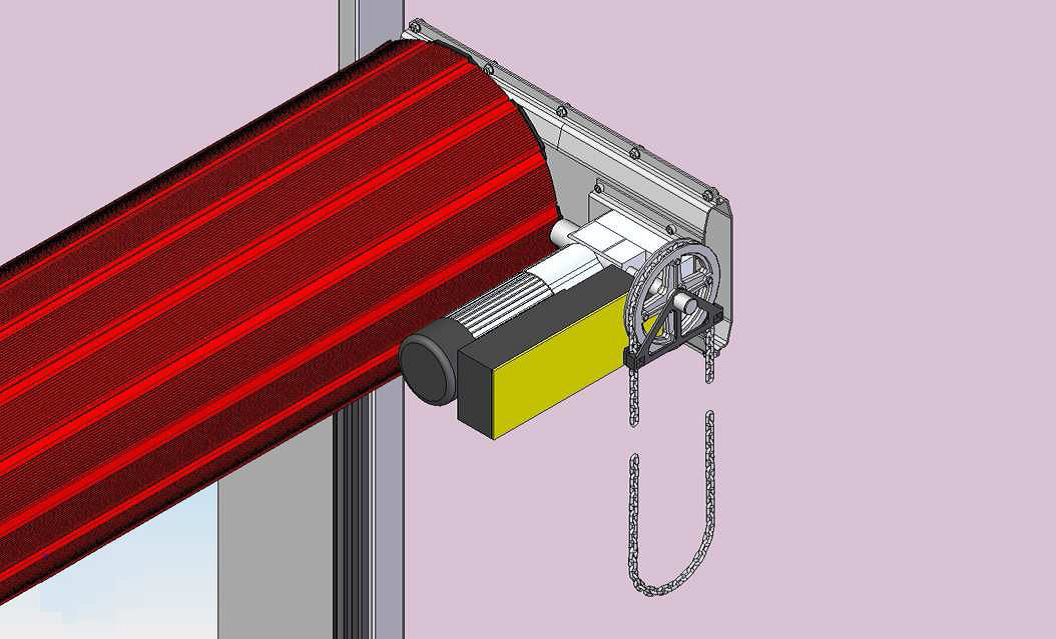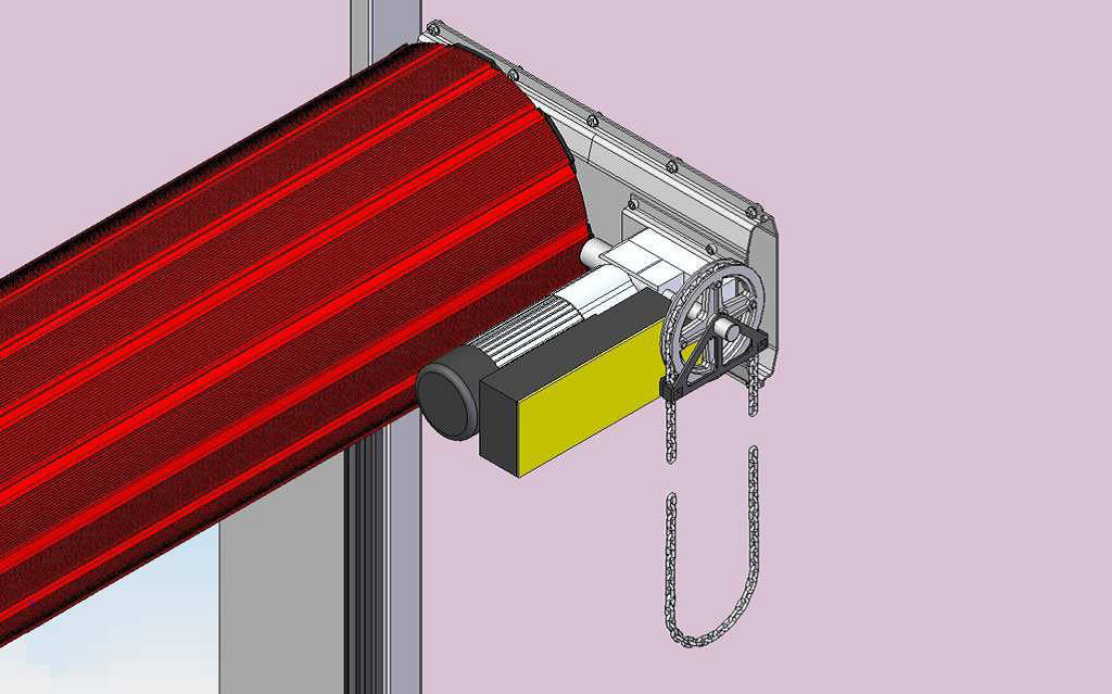 Ein Schutzdeckel für die Wickeltrommel und den Motor ist ebenfalls möglich und wird erforderlich, wenn das Tor auf der äußeren Seite der Öffnung montiert wird. Dieser Schutzdeckel ist bis zu einer Torhöhe von 2500 mm Pflicht, um den Motor und andere mechanische Teile vor äußeren Einflüssen zu schützen.