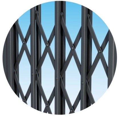 Die Scherengittertore bestehen aus senkrechten Stäben mit Laufrollen, die an einer Deckenführungsschiene aufgehängt sind. Unterhalb des Tores befindet sich eine Bodenführung mit einem U-Profil, das bei geöffnetem Tor entfernt werden kann, um den Zugang zu erleichtern.