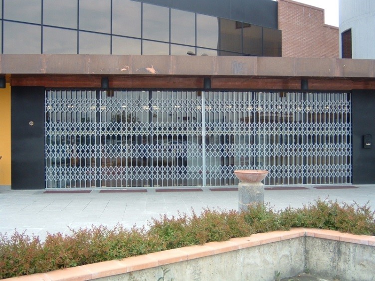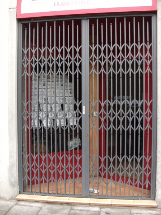 Scherenmetalltore aus verzinktem Stahl bieten Schutz für Glasschaufenster und Geschäftseingänge. Diese Tore sind besonders robust und bieten effektive Sicherheit.
